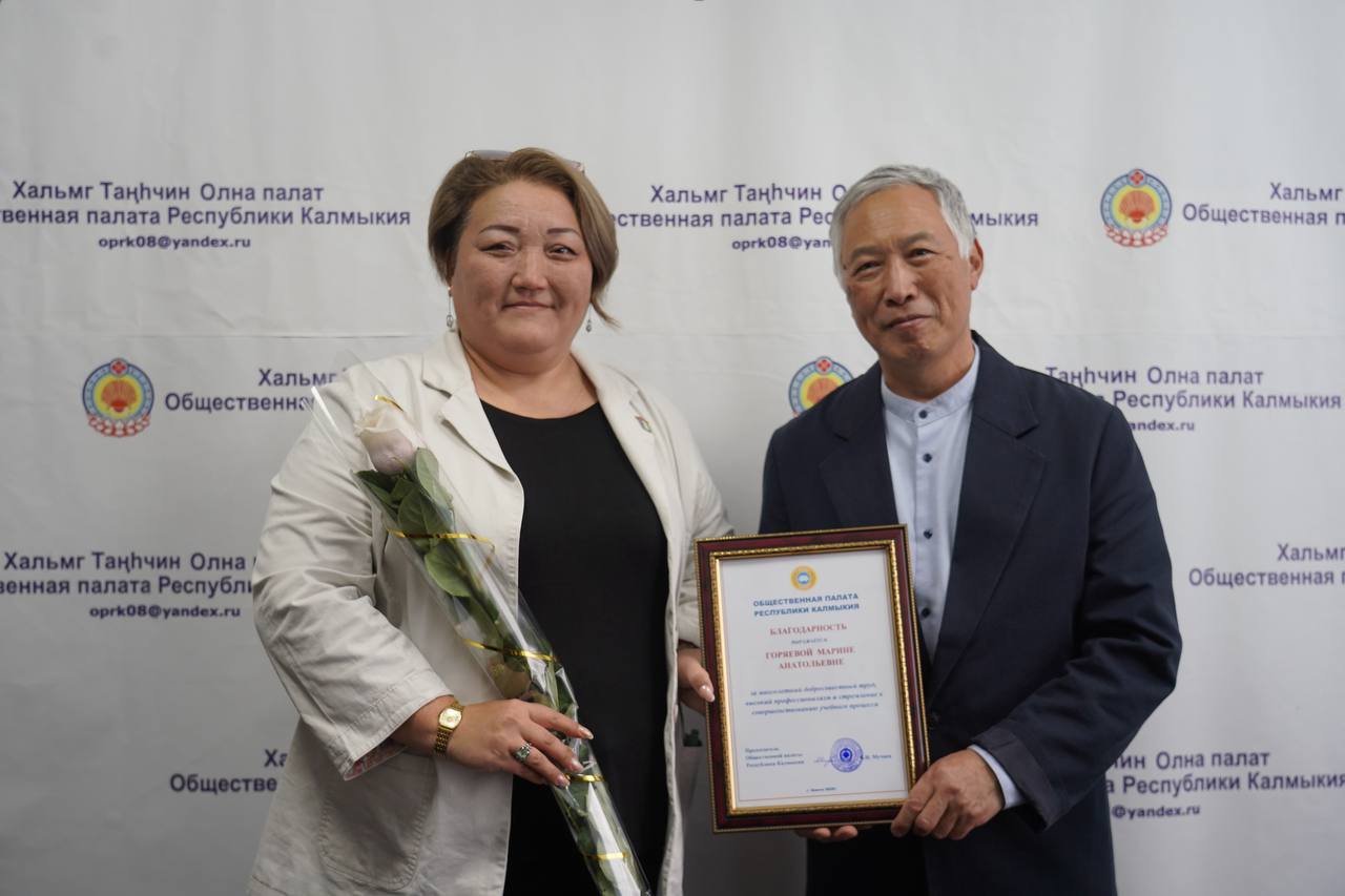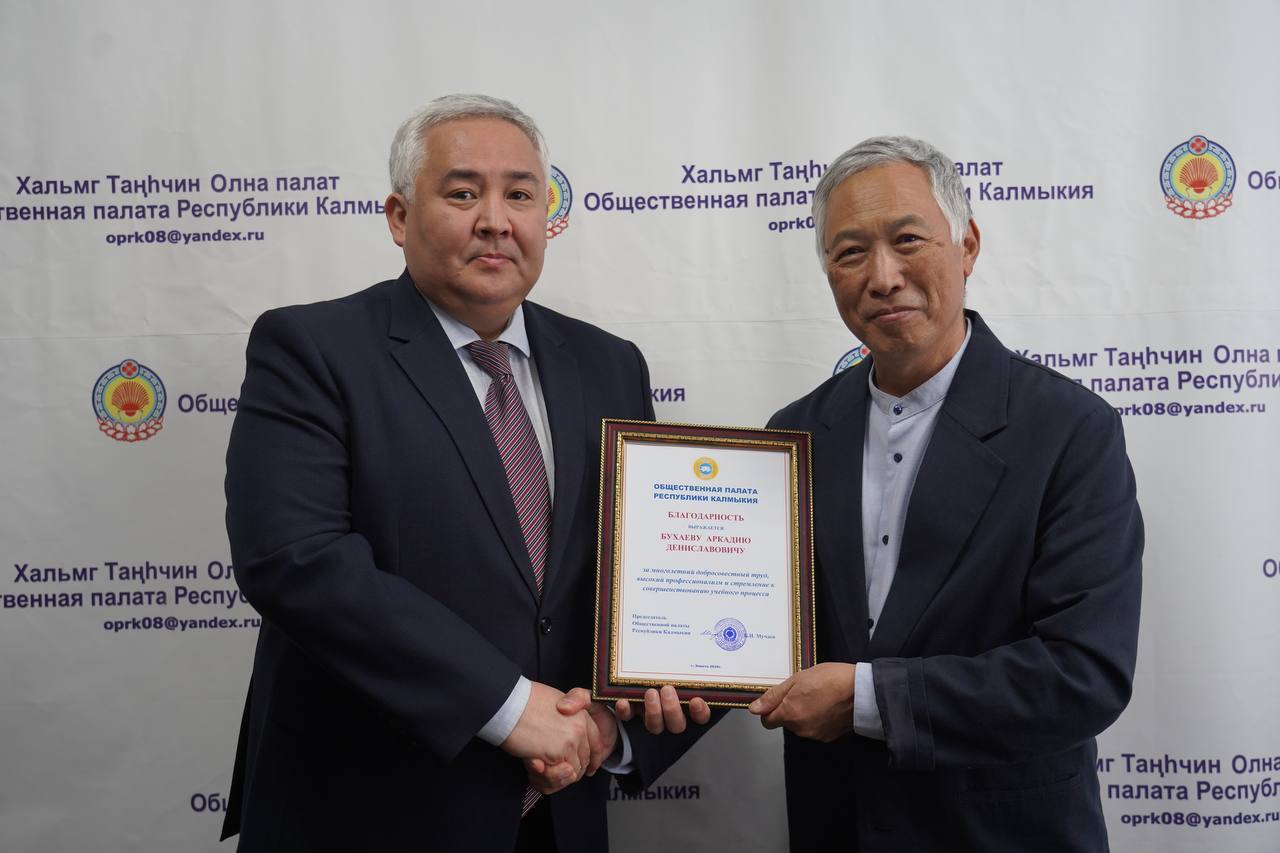 Сегодня в нашем университете есть особенный повод для гордости и радости. В торжественной обстановке за многолетний добросовестный труд, профессионализм и стремление к совершенствованию учебного процесса председатель Общественной палаты Республики Калмыкия Батыр Иванович Мучаев вручил благодарности первому проректору Бухаеву Аркадию Дениславовичу и методисту по воспитательной работе — Горяевой Марине Анатольевне.